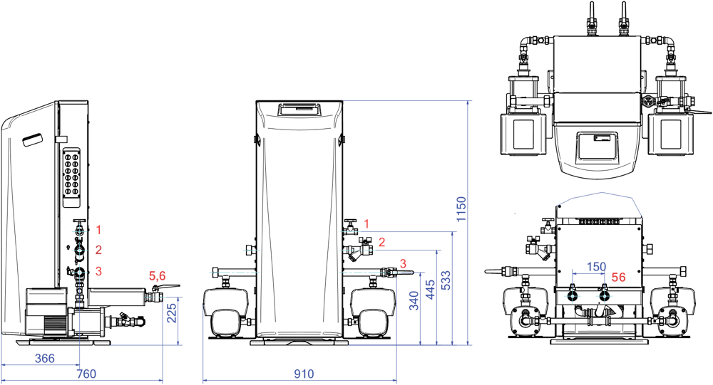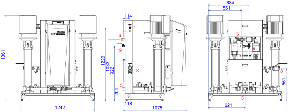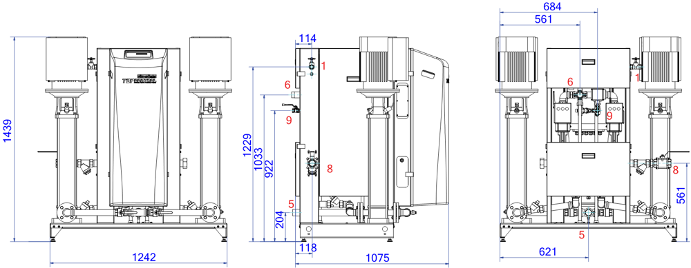 Il TopControl Modular MAXI Twin è un dispositivo automatico di espansione e mantenimento della pressione. L'unità contiene 2 pompe VFD (2x 100%) e 2 valvole di troppo pieno controllate elettronicamente. È necessario un serbatoio di stoccaggio EP separato.
